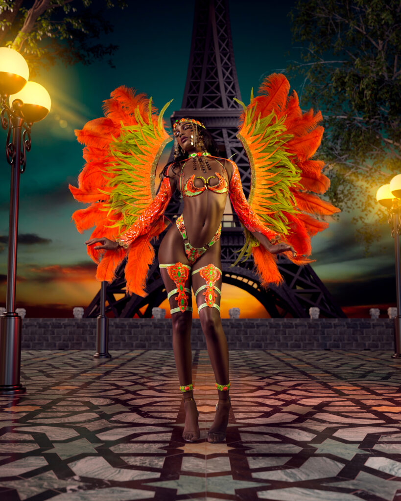 At the St. George’s showroom tucked away on Kirana James Boulevard, Harley and her team made the magic happen for their 2023 staging. This year the theme was “Around the World,” and inside the mas camp, costumes decorate the walls. A vision actualized and it’s evident that Harley’s ambitions are clear. She’s fully driven by the desire to transform the interactions revelers have with their band and it only took one moment for her to gain perspective.